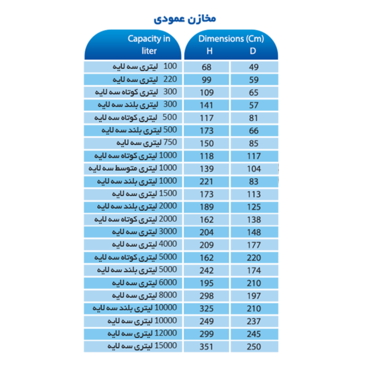 | مناسب برای | ذخیره آب شرب و مصارف خانگی در شرایط محدود ارتفاع |