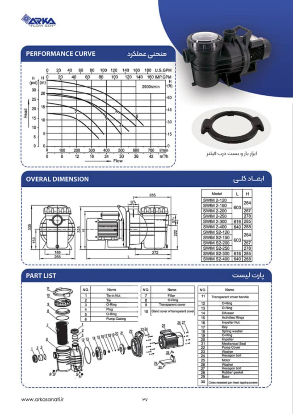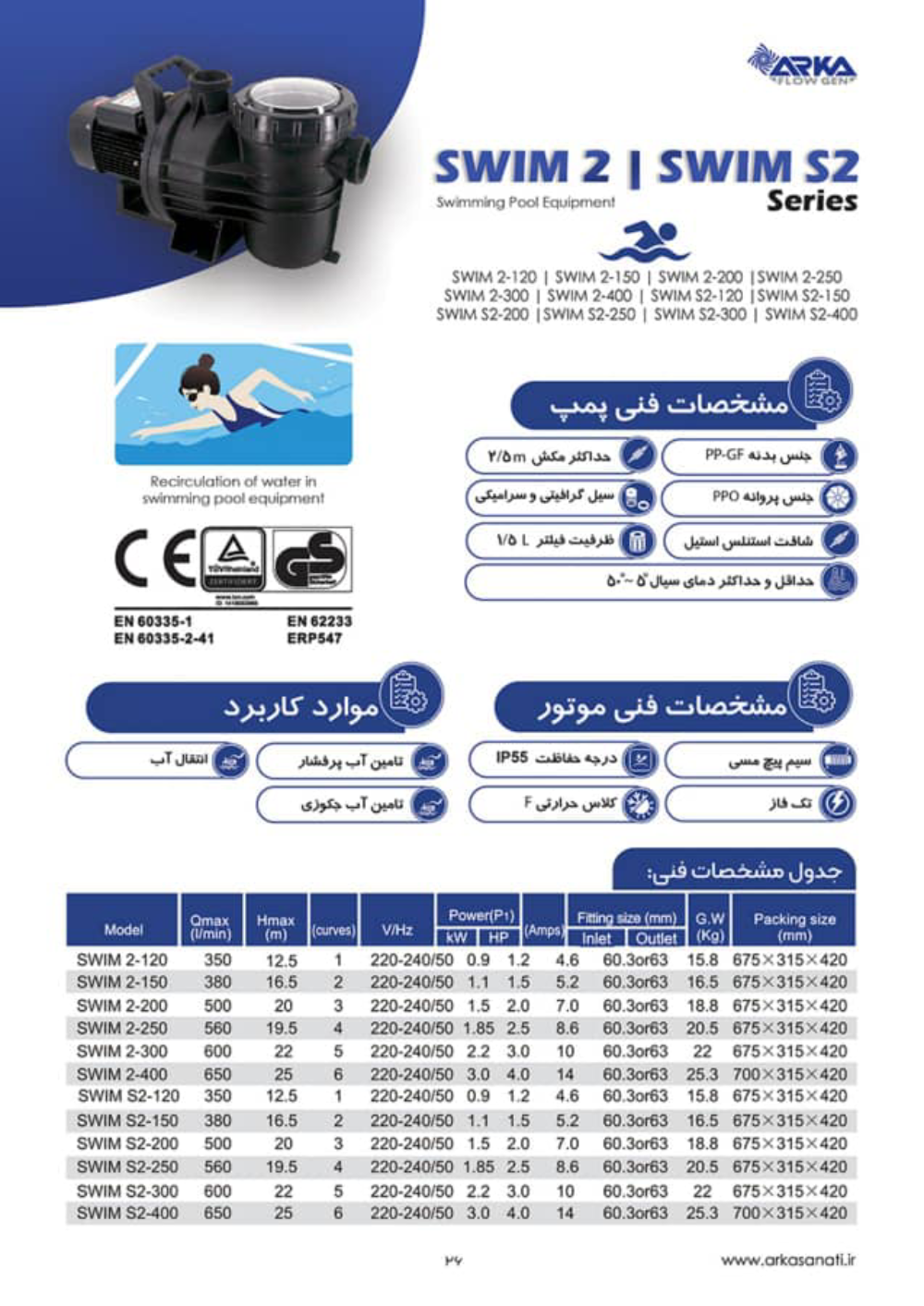 🔵 جدول مشخصات فنی پمپ تصفیه استخری آرکا SWIN2-120